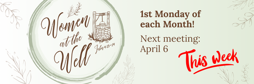 Women at the Well meets this Monday, April 6! This ministry is open to all ladies of IBC, as well as any guests you'd like to bring along. Light refreshments will be served. Please register for each monthly meeting- thank you!